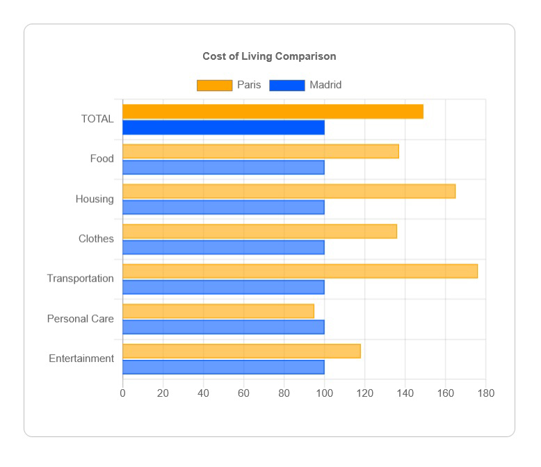 - We start by comparing the average cost of living in Madrid to that of other cities.