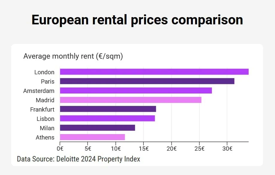 In terms of rental prices, Madrid becomes a bit more expensive. With an average price of 25.4€ per square meter, it sits well above the mean and median rental prices in other European capital cities. Moreover, rental prices have increased rapidly over the past year as Madrid as many people from South America, Mexico and the US flock to the city. Morale of the story? If you want to move to Madrid, we recommend buying a home, rather than renting it, if you have the budget.