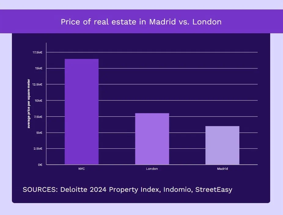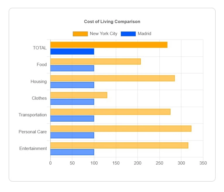 Although real estate prices in NYC are extremely high compared to those in Madrid, NYC is significantly more expensive than Madrid across every indicator in cost of living indices.