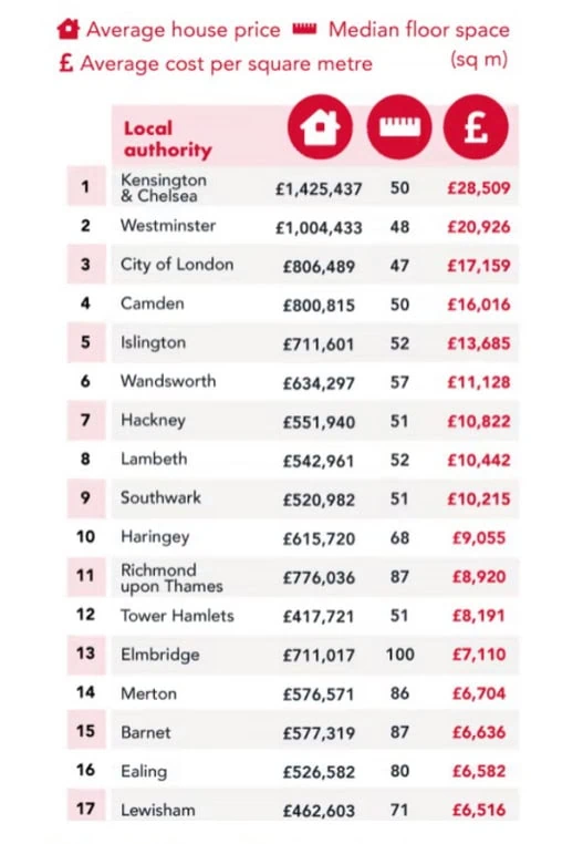 London, like NYC, has premium neighborhoods where pricing is much higher than the average. Real estate prices in the City of London average £17,159 per square meter. Real estate prices in Westminster average £20,926 per square meter. The most expensive real estate in London is found in the Royal Borough of Kensington & Chelsea, where prices average £28,509 per square meter.