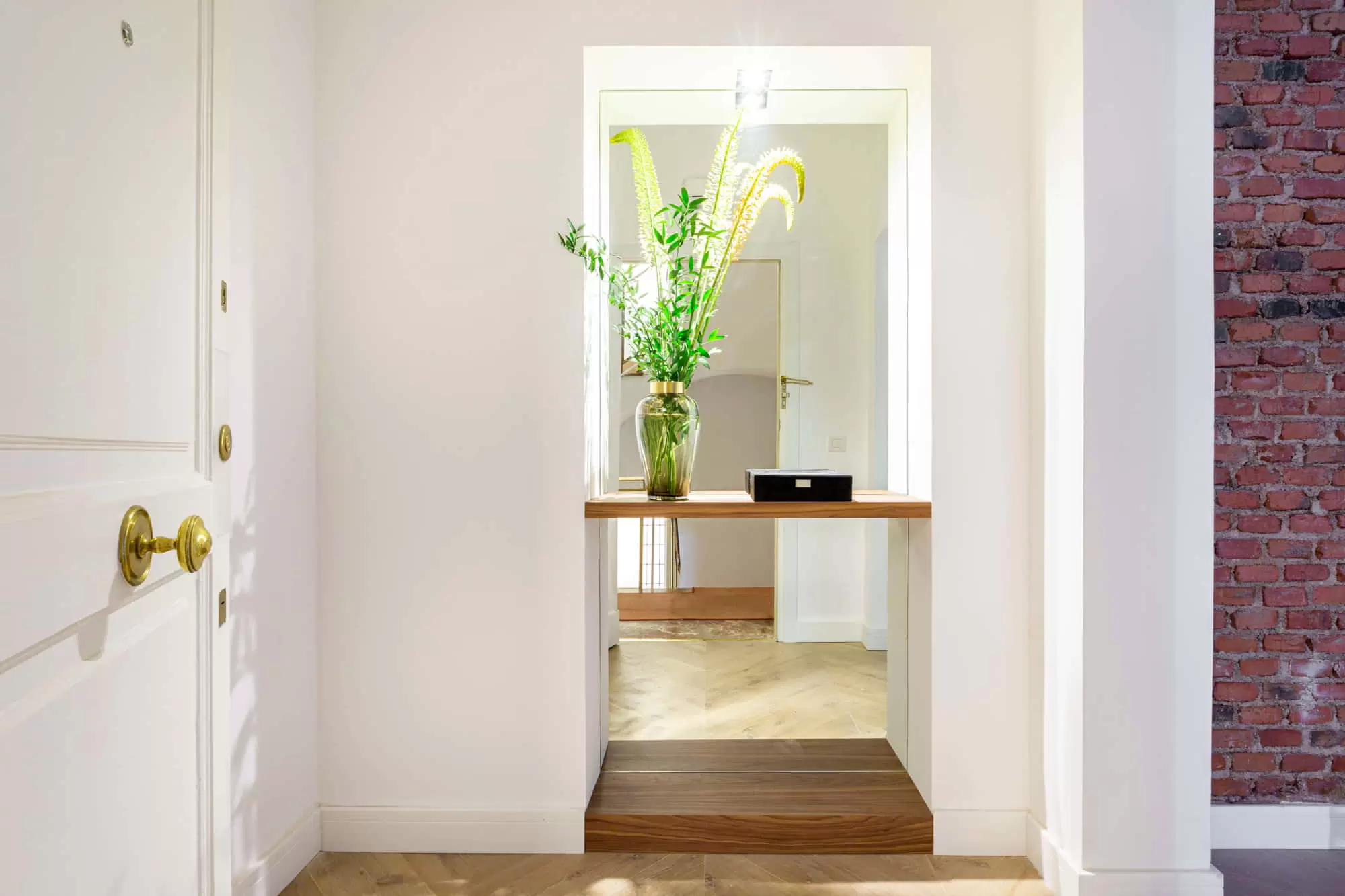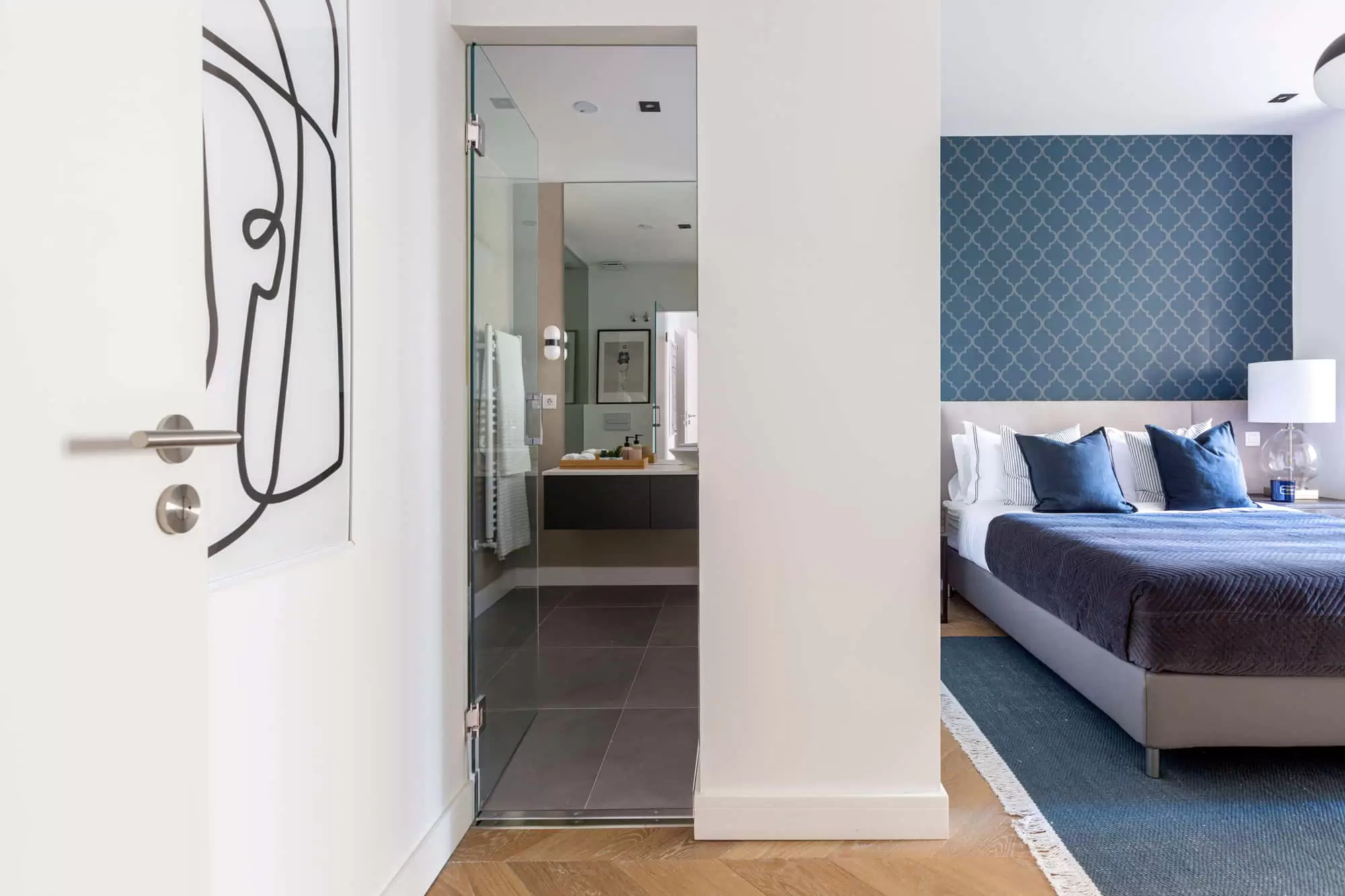 The entrance hallway includes a guest bathroom with a stylish design of wallpaper.