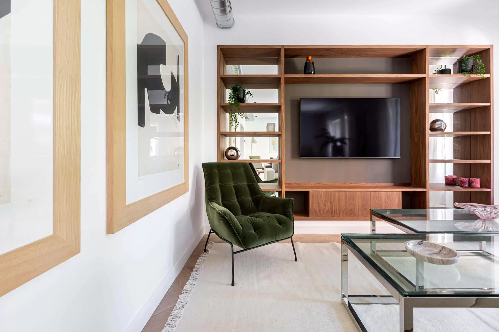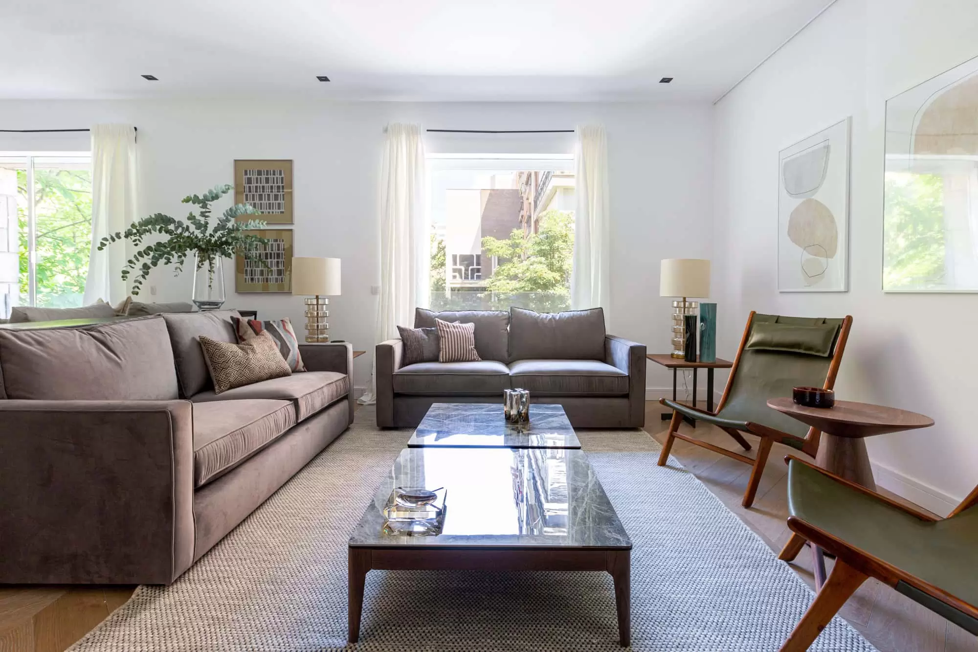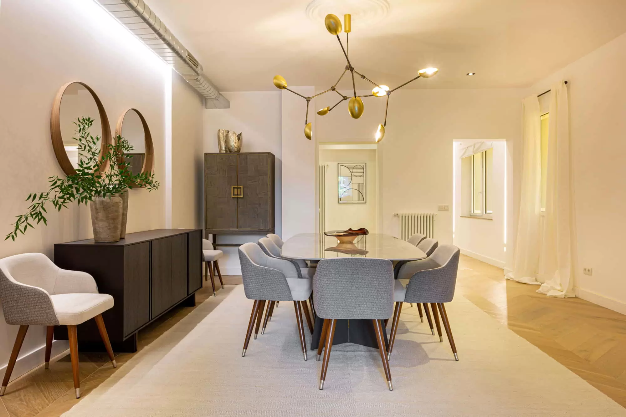 The living room of this gorgeous apartment in Salamanca is divided into two environments, one of them perfect for entertaining featuring a built-in wooden TV and a large flat-screen Smart TV installed on a wall bookshelf, a stylish contemporary ceiling lamp, a large modern sofa, and one blue vintage armchair from the 60s. The other one features a vintage wooden bar, two large sofas and two modern armchairs. It features twoo remarkably sized windows with beautiful views that ensure the living room is flooded with natural light. Throughout the apartment you will find windows that make the most of the magical Madrid sunlight.