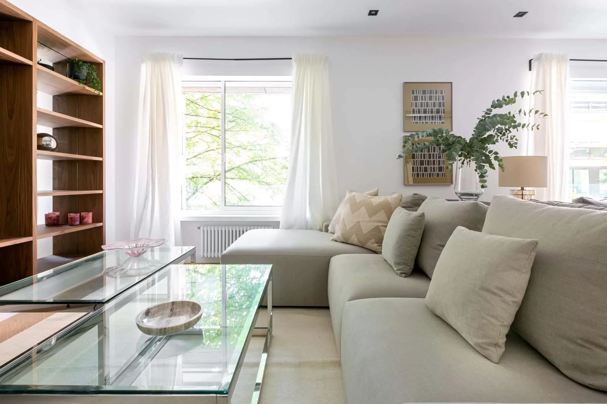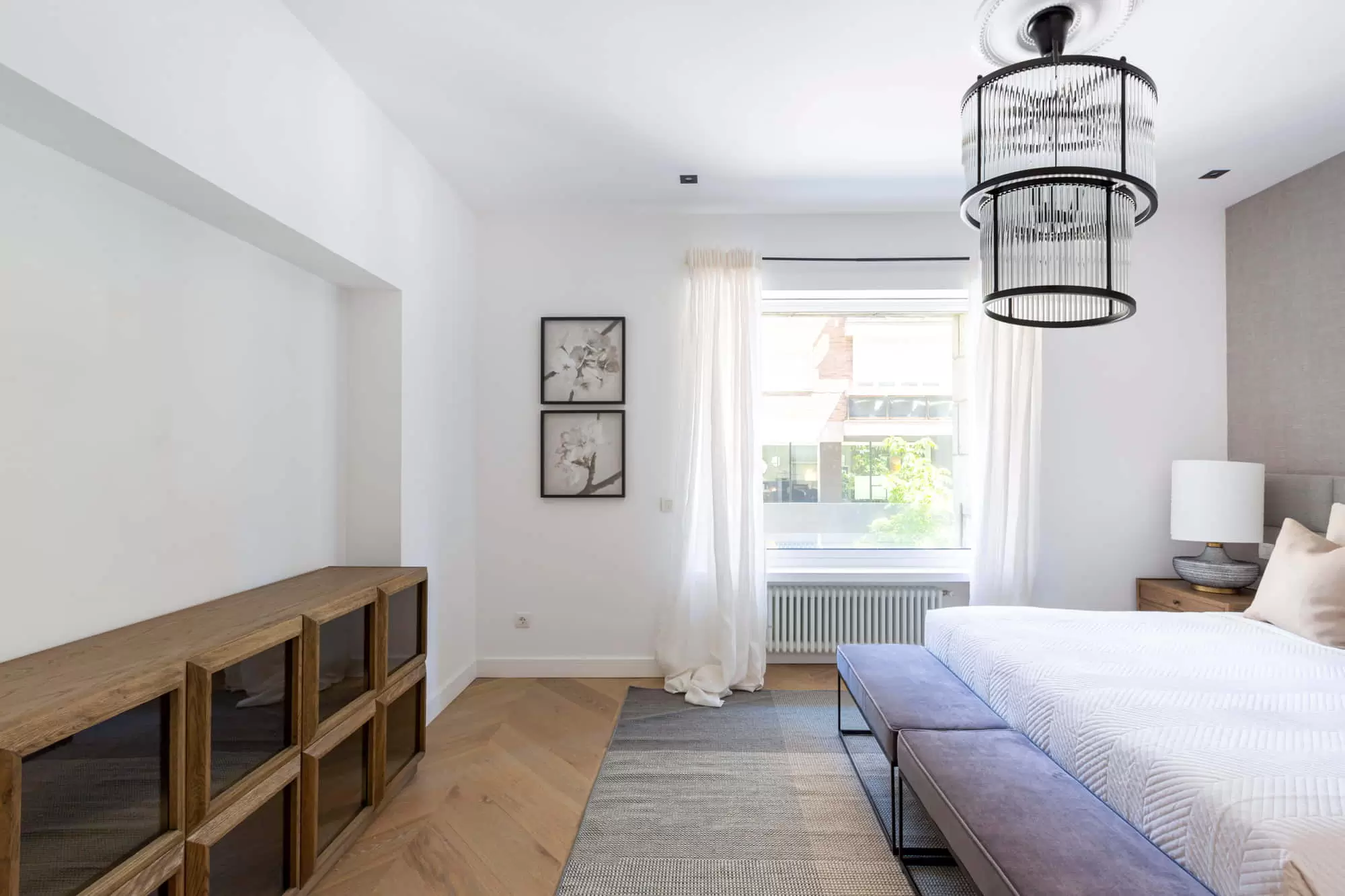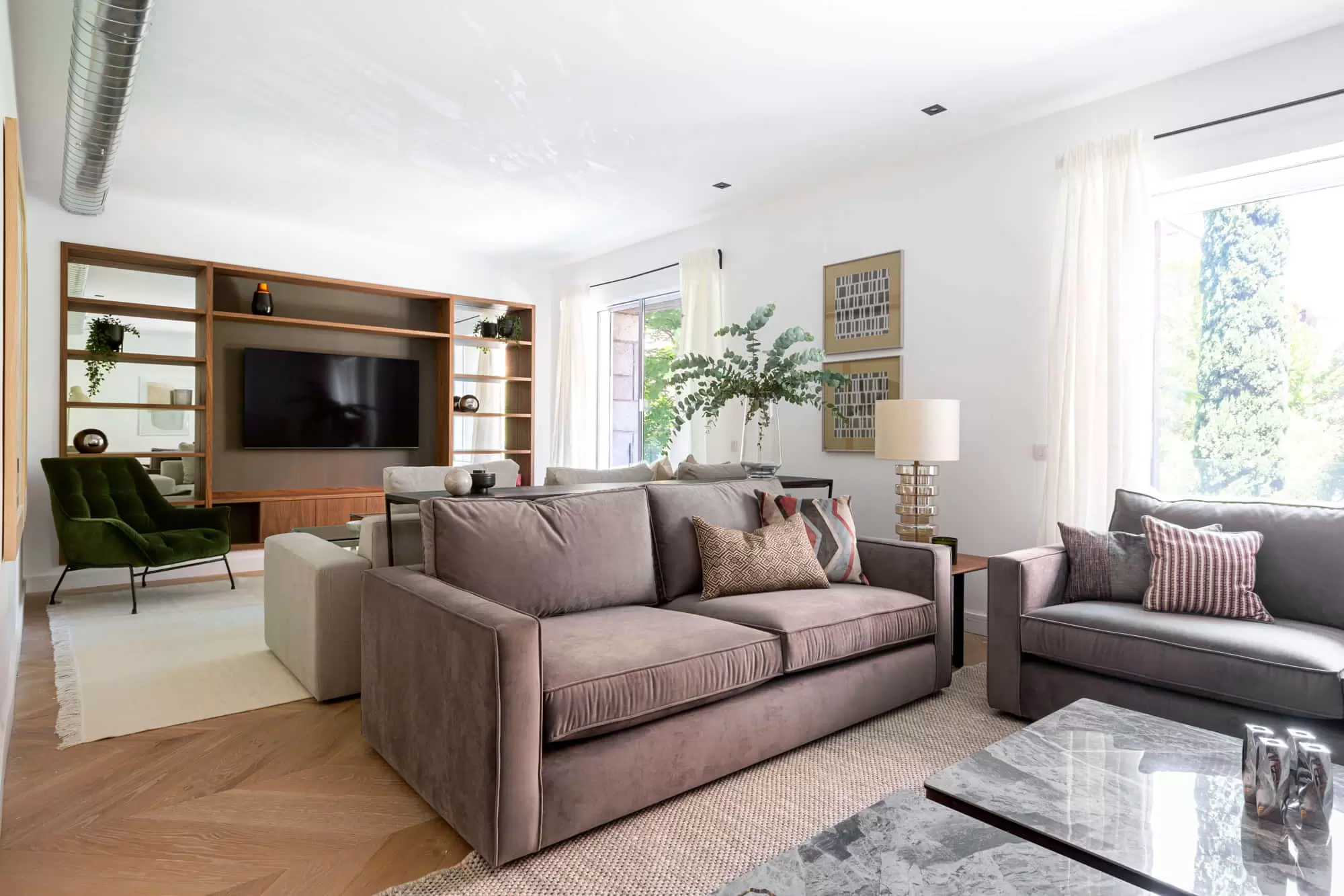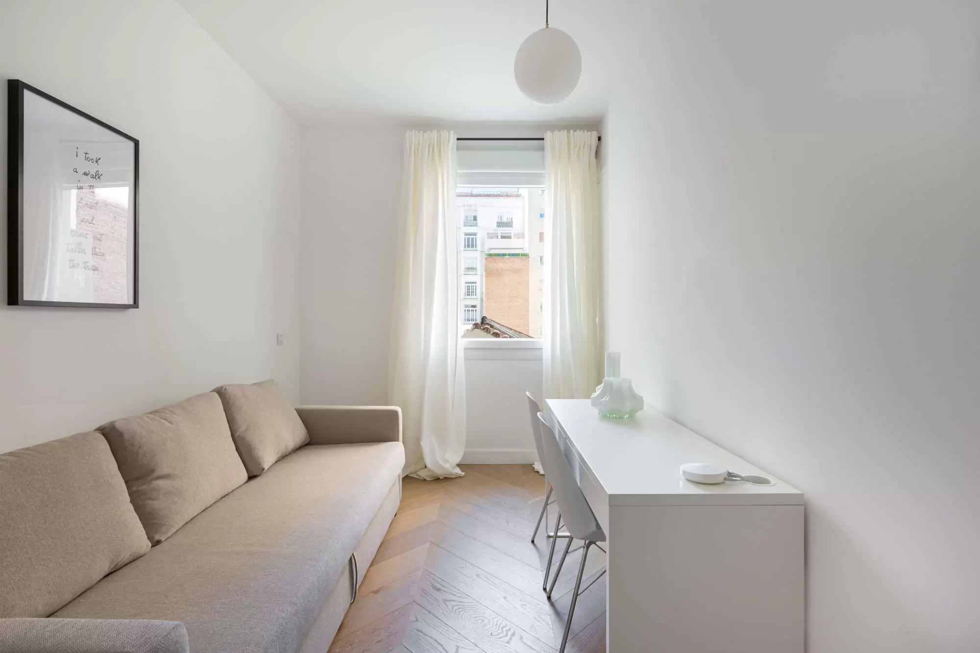 The living room of this gorgeous apartment in Salamanca is divided into two environments, one of them perfect for entertaining featuring a built-in wooden TV and a large flat-screen Smart TV installed on a wall bookshelf, a stylish contemporary ceiling lamp, a large modern sofa, and one blue vintage armchair from the 60s. The other one features a vintage wooden bar, two large sofas and two modern armchairs. It features twoo remarkably sized windows with beautiful views that ensure the living room is flooded with natural light. Throughout the apartment you will find windows that make the most of the magical Madrid sunlight.