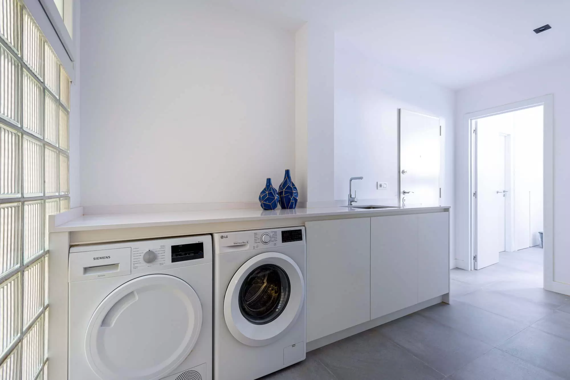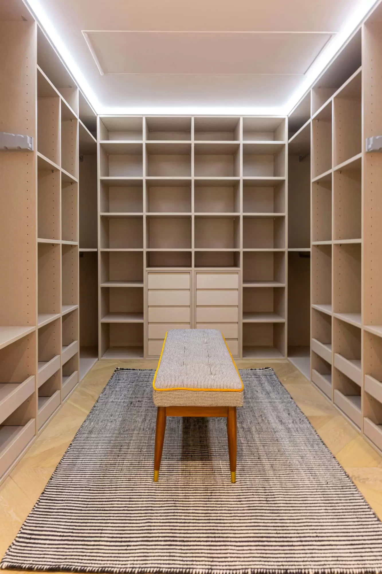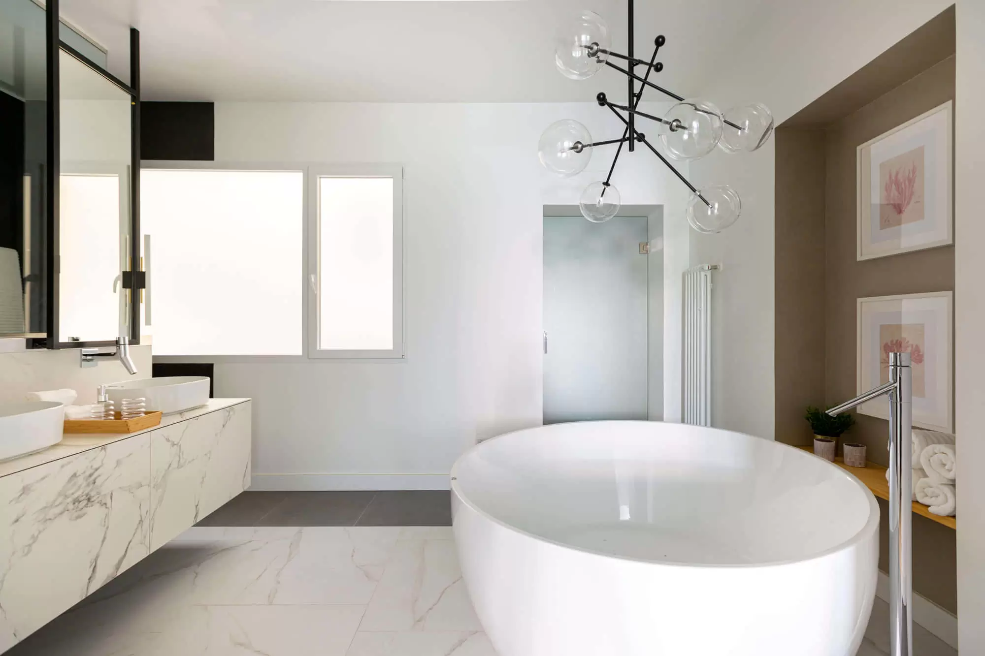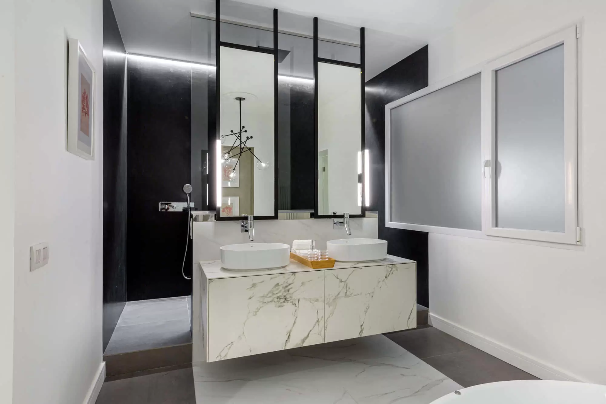 The master suite enjoys a King-size bed (2.00 x 2.00m), a private giant dressing room with mirrored doors, a flat-screen Smart TV, a design armchair and an en-suite marble top bathroom with double sinks and a shower and a modern design bathtub with a separated toilet.​