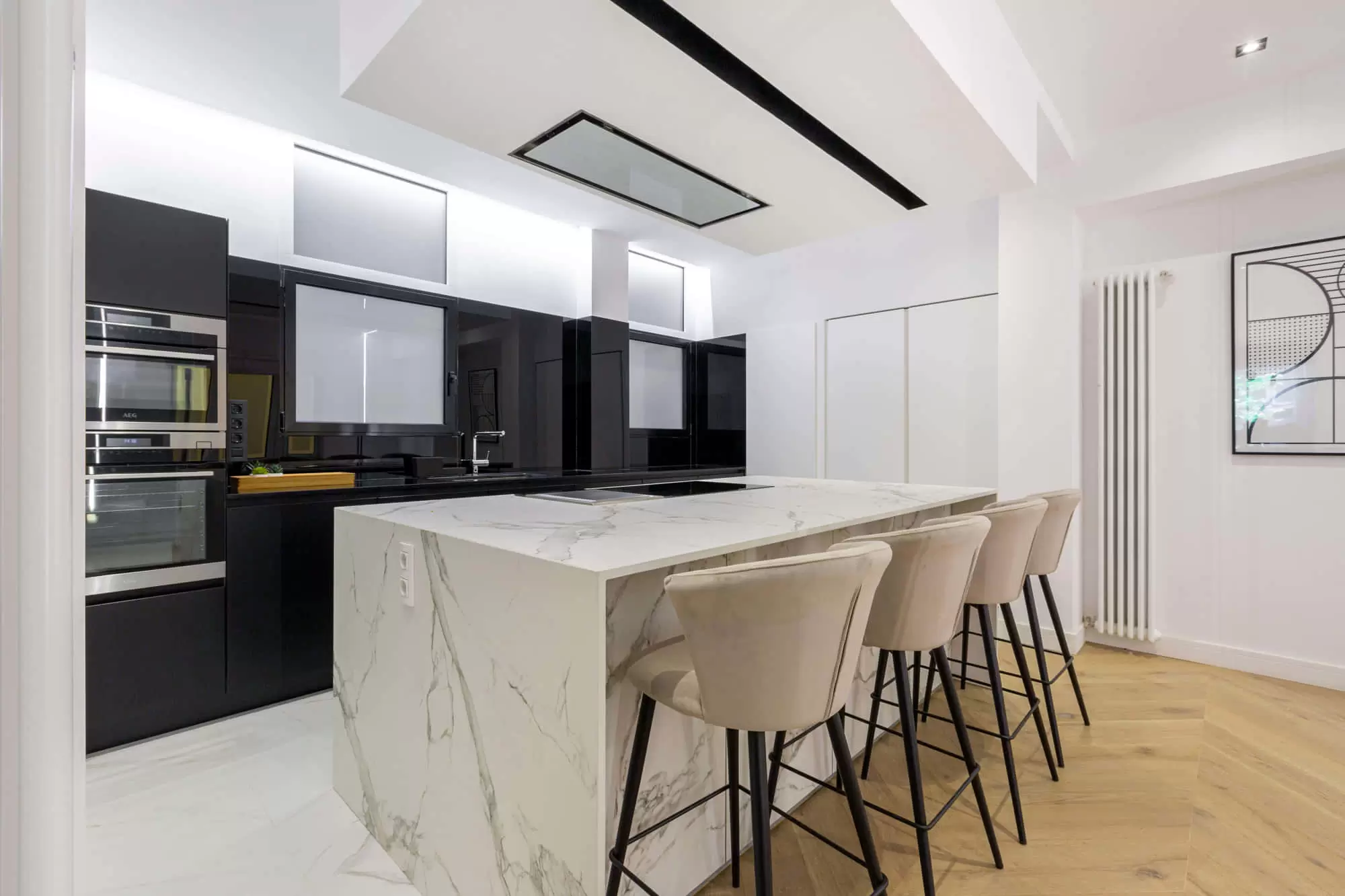 This home combines impeccably restored interiors with top of the line materials and the conveniences of contemporary amenities, making it the perfect home away from home for a family trip.  High ceilings and large windows adorn the whole space, pairing modern and classic furniture together with modern art create a sense of opulence so you can experience Madrid like a local.