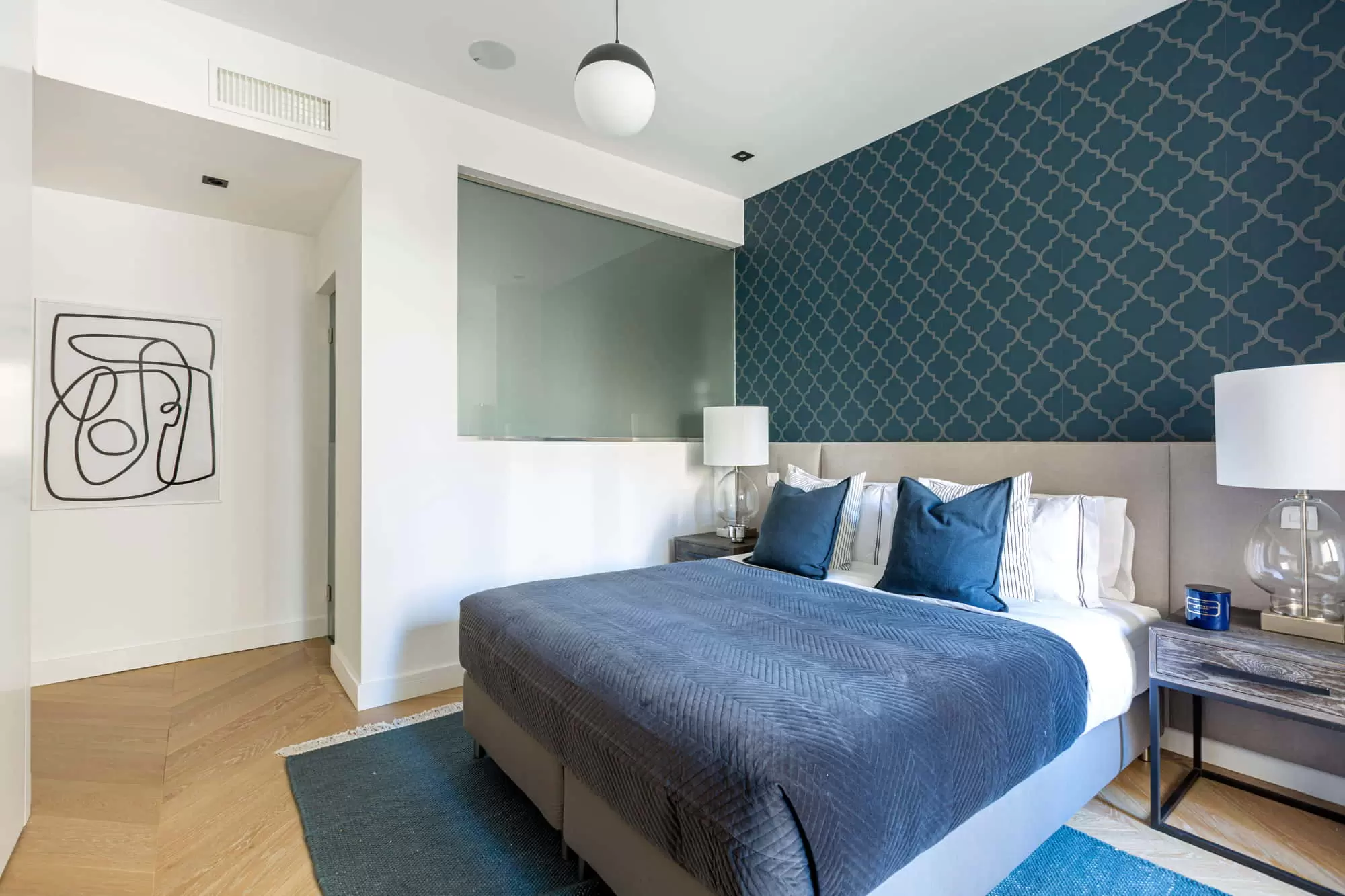 The second bedroom includes a double bed (1.60 x 2.00m) with blue fabric headboards, two-night tables, built-in closets and en-suite bathroom with shower.