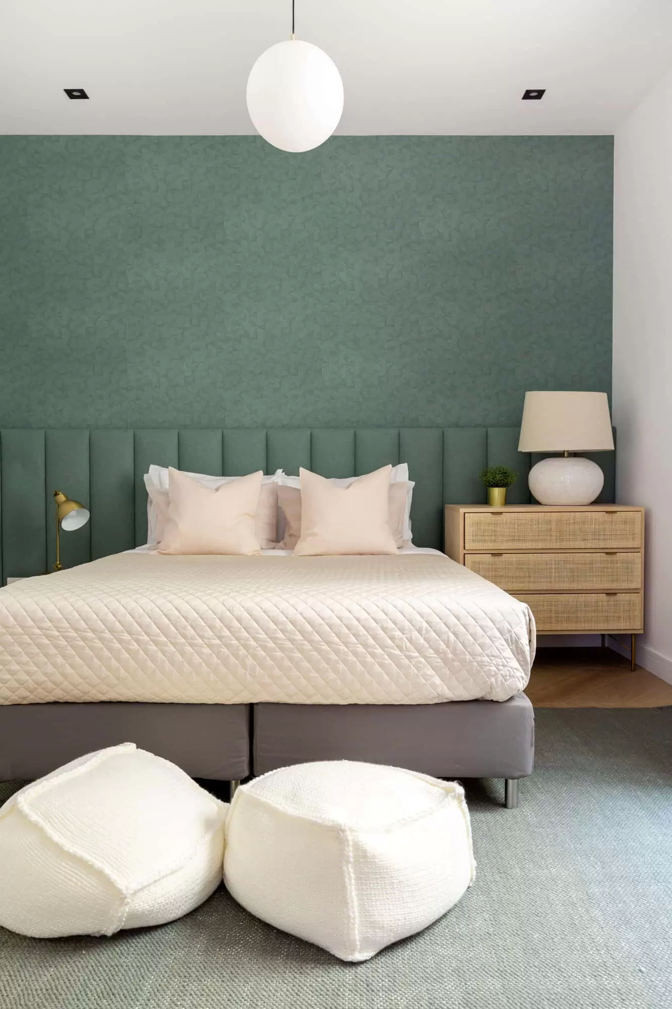 The third bedroom features another double bed  (1.60 x 2.00m) with very white and cream lines together with a fabric headboard and night tables, built-in closets, and en-suite bathroom with shower.