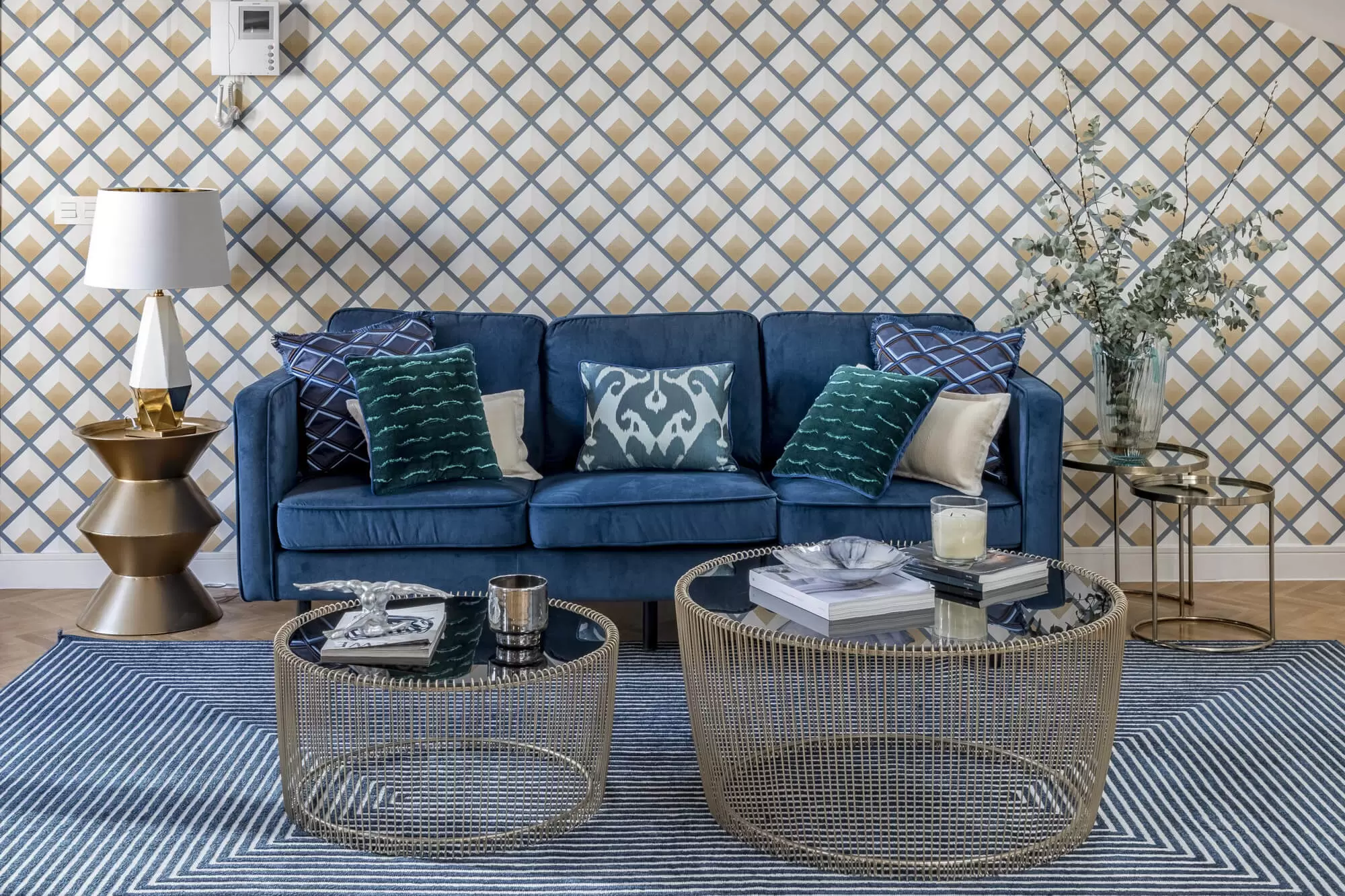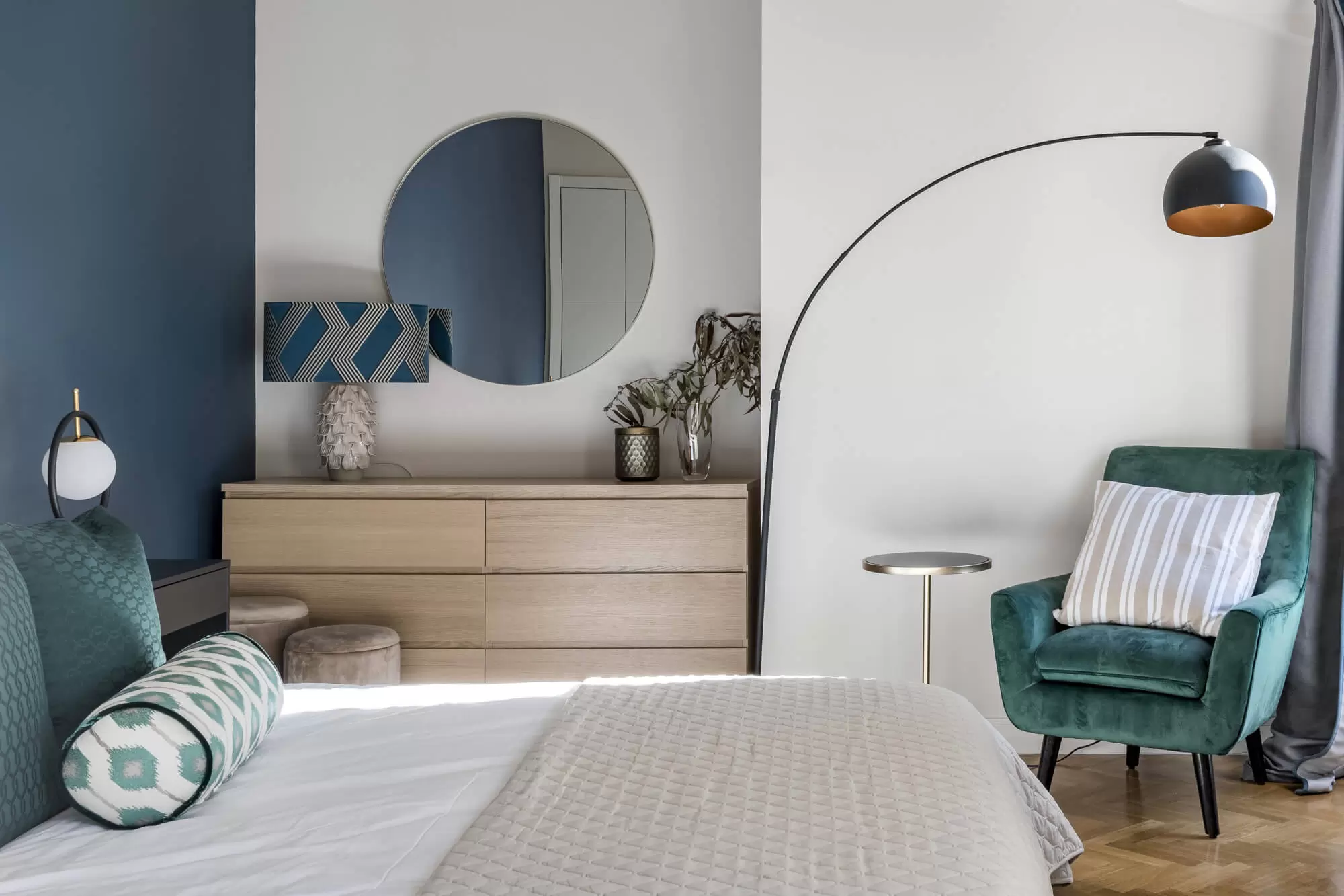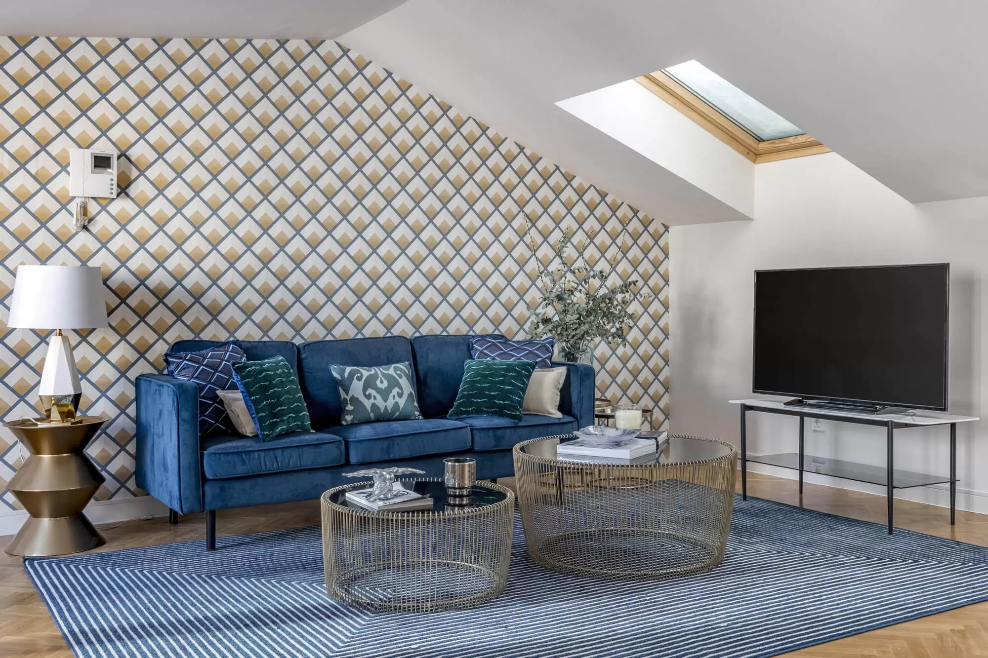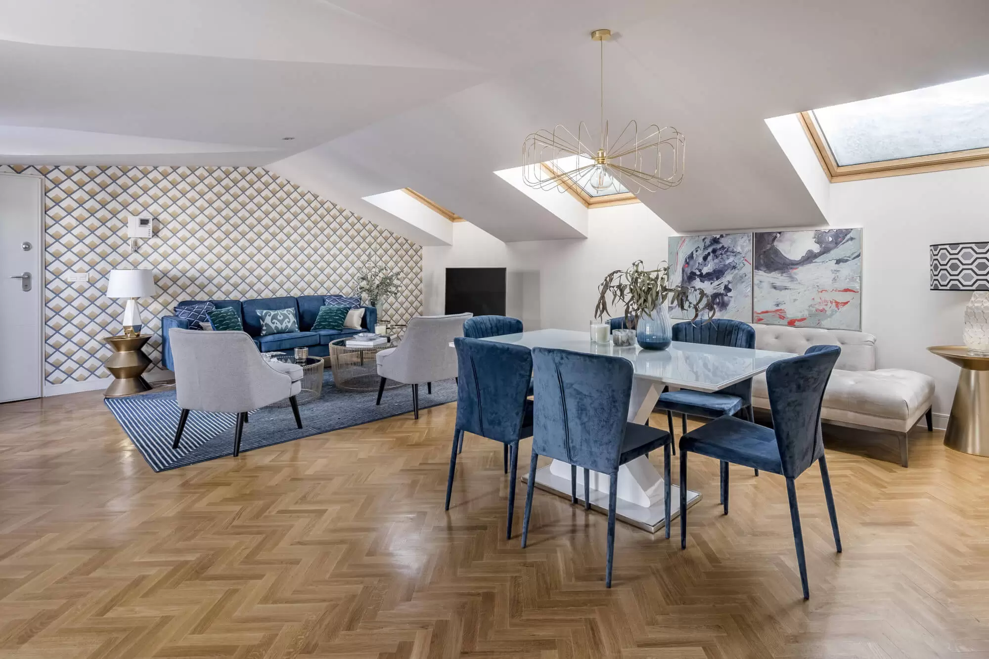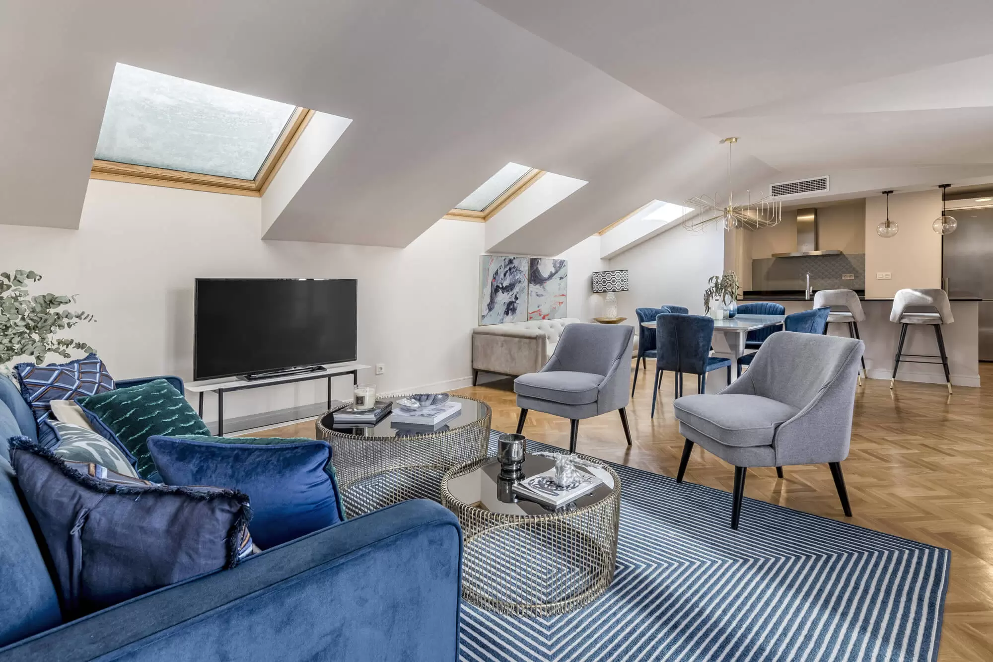 The main living room of this apartment combines the dining and living room area with an open kitchen, it creates a bright and open area where everything is within perfect reach. It is equipped with two 3 seater sofa and one large bench. There’s also a coffee table and a smart flat TV screen so you can relax and watch your favorite shows after a long day of work or visiting the city.