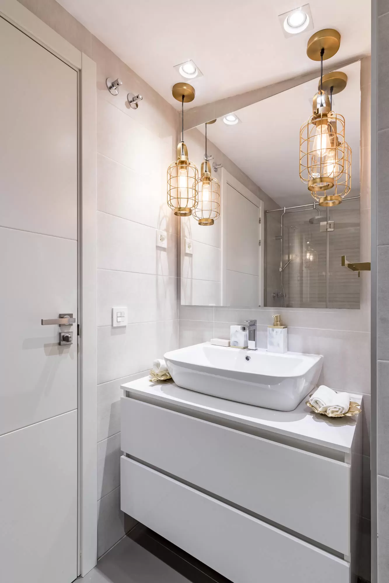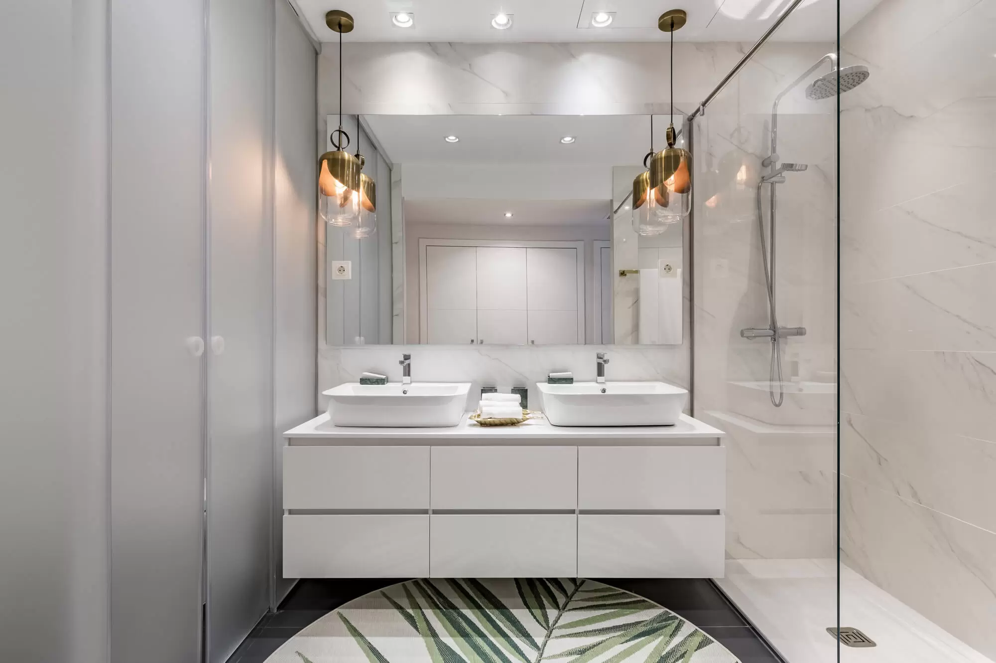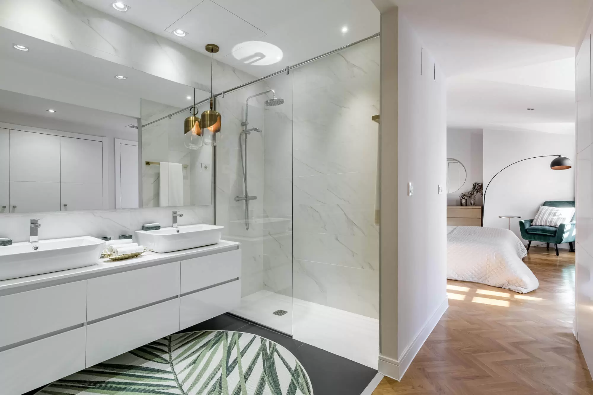 The main bedroom comes with a double-size bed (1.80 x 2.00 ) with two minimalist nightstands on each side and light. It also has enough storage space, as there’s a full wardrobe wall and en suite bathroom with a shower, two sinks and a large mirror to get you ready for your morning routine.