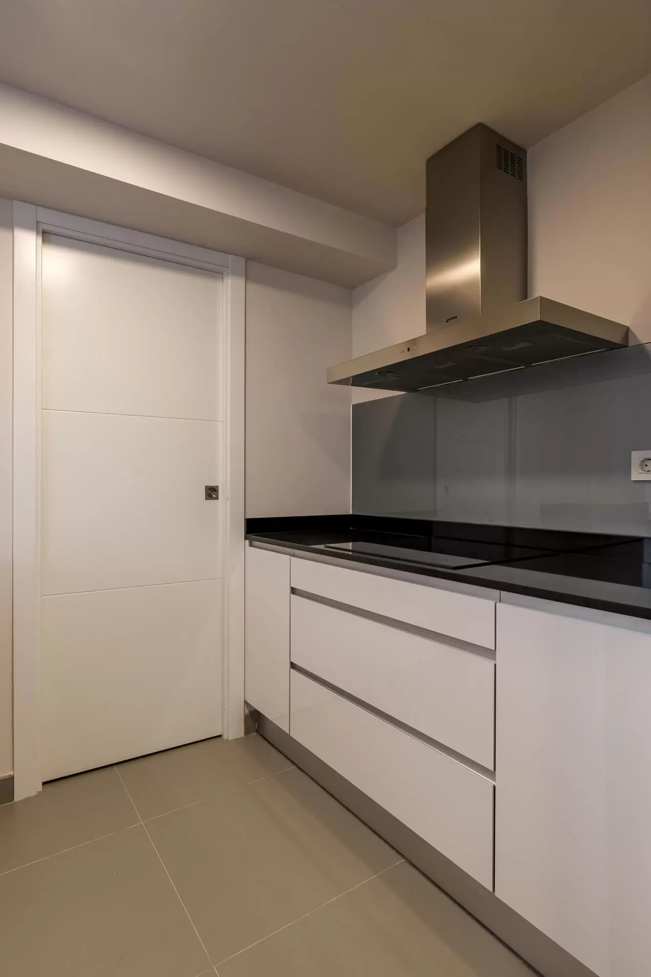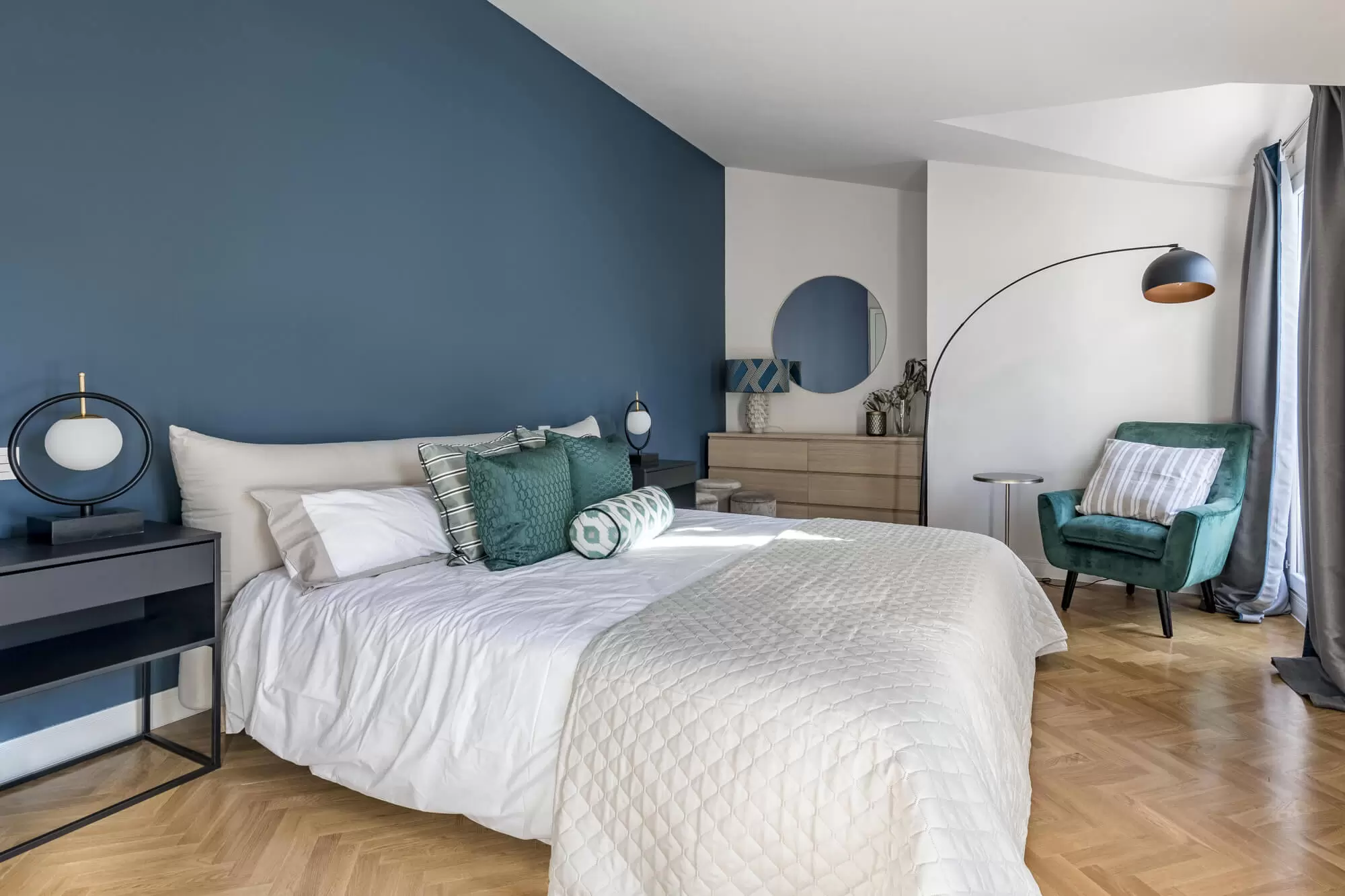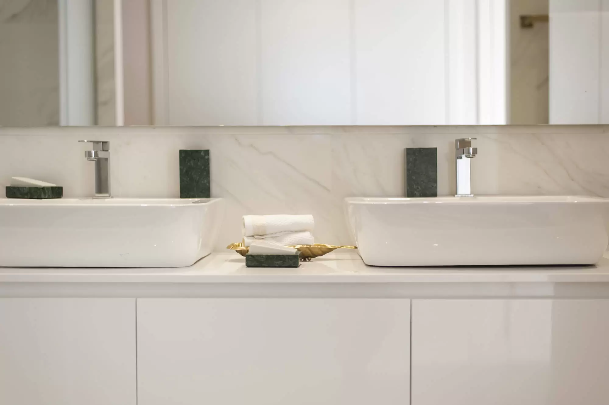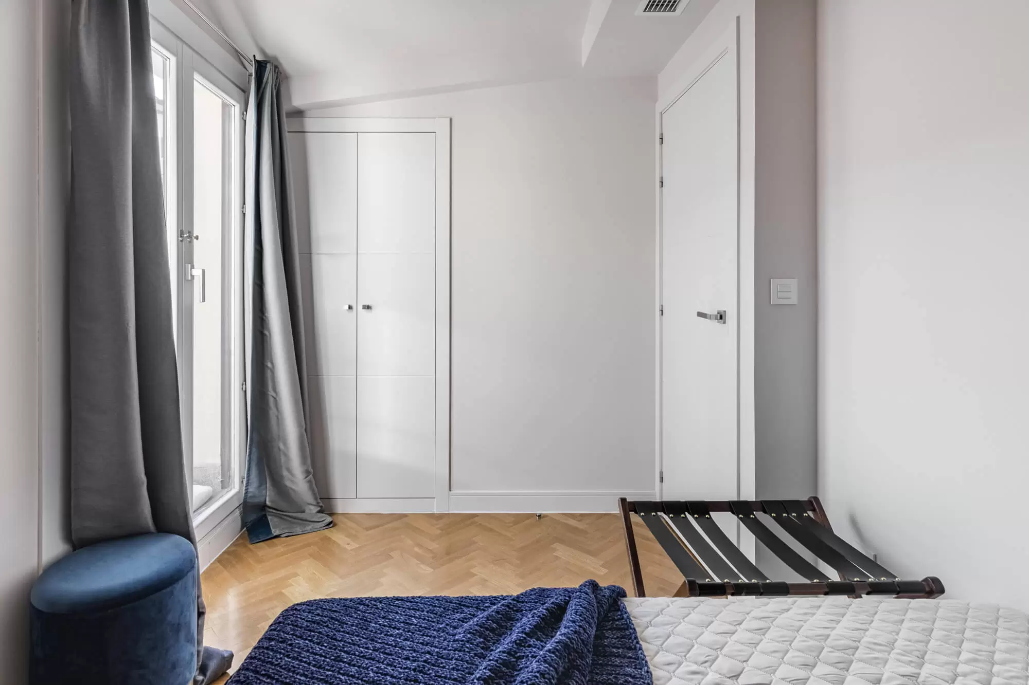 The main bedroom comes with a double-size bed (1.80 x 2.00 ) with two minimalist nightstands on each side and light. It also has enough storage space, as there’s a full wardrobe wall and en suite bathroom with a shower, two sinks and a large mirror to get you ready for your morning routine.