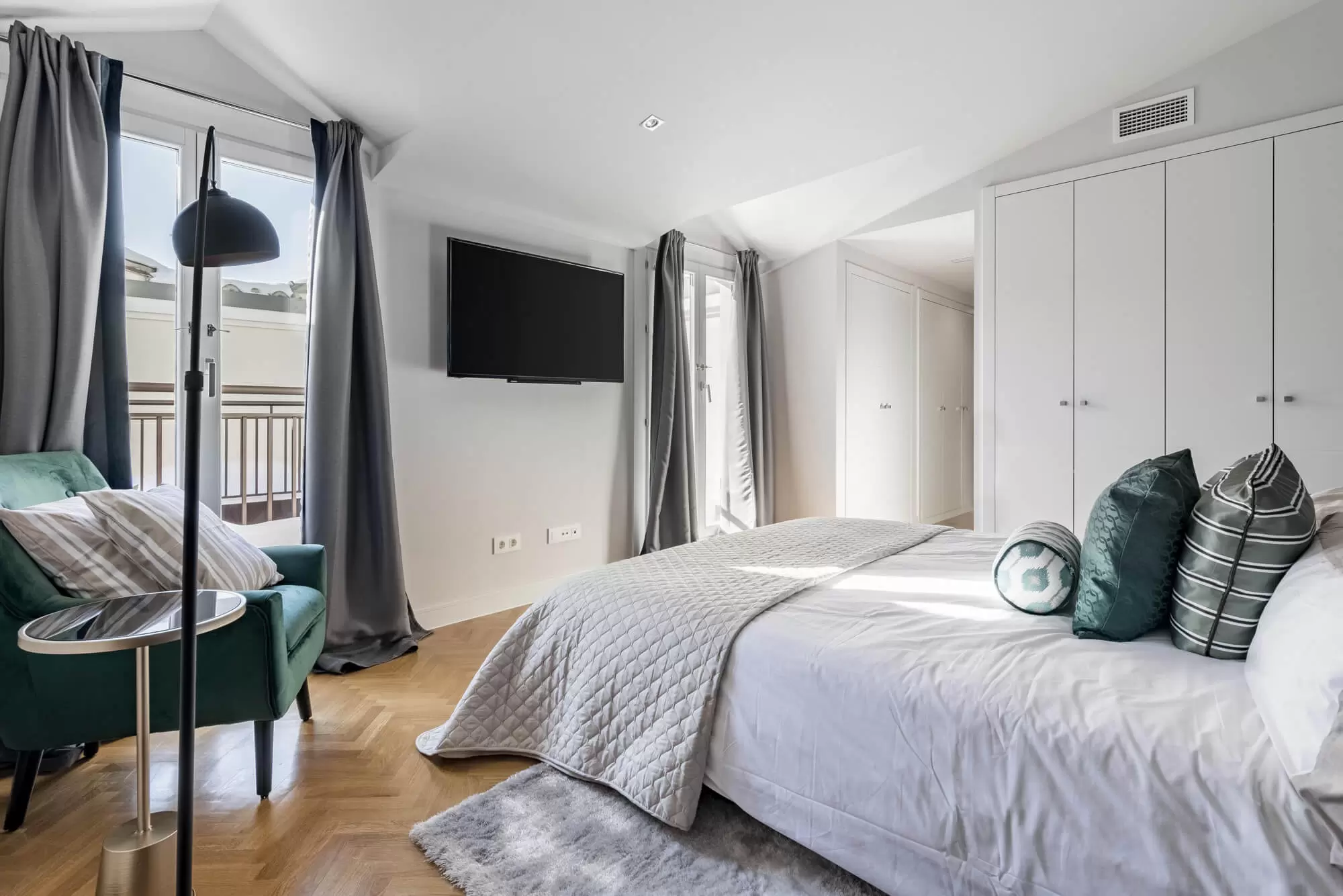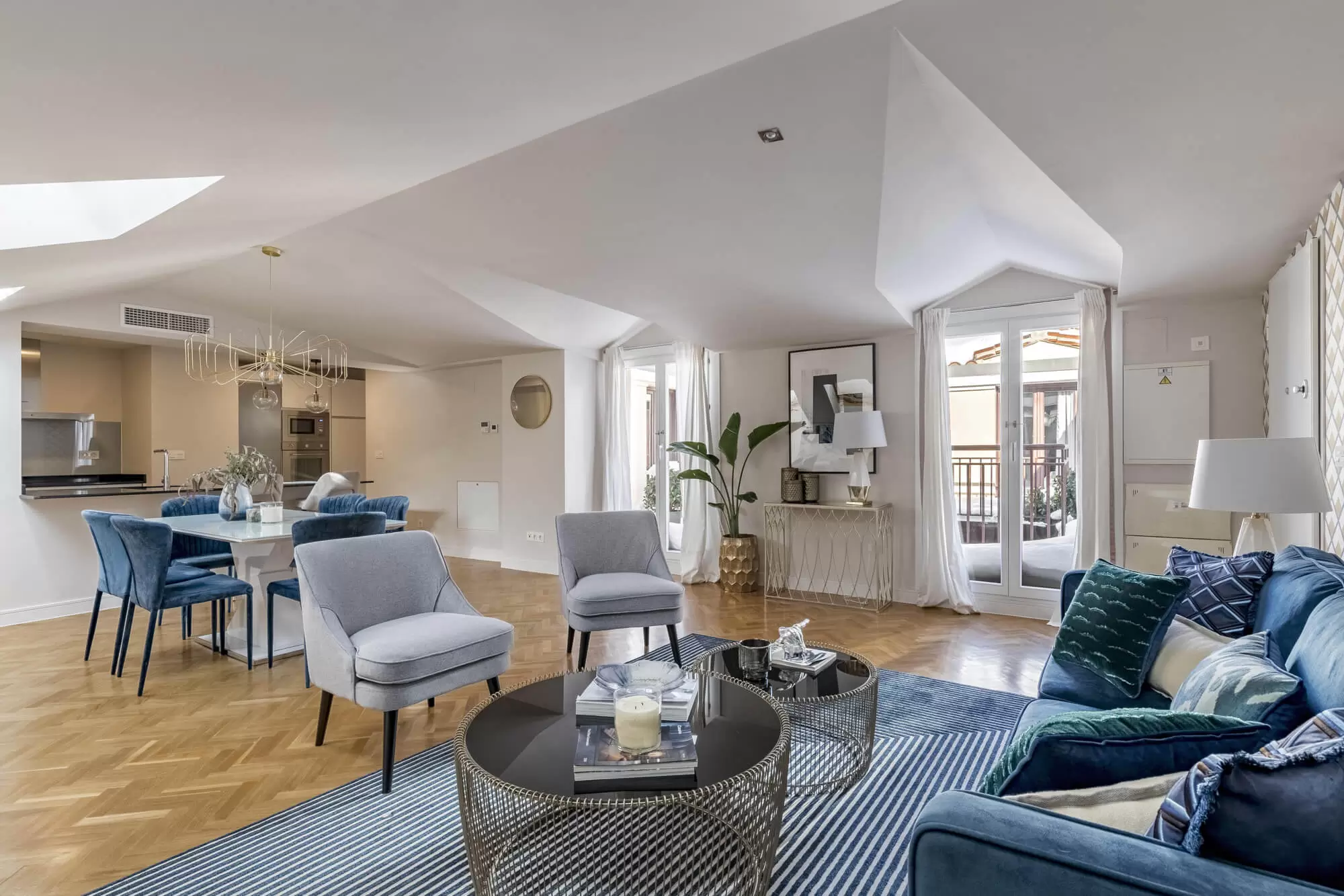 This incredible penthouse apartment in Madrid is located in one of the most highly desired streets in the neighborhood of Lavapies. The area is characterized for being hip and trendy and near Atocha railway station, Reina Sofia Museum and Prado Museum