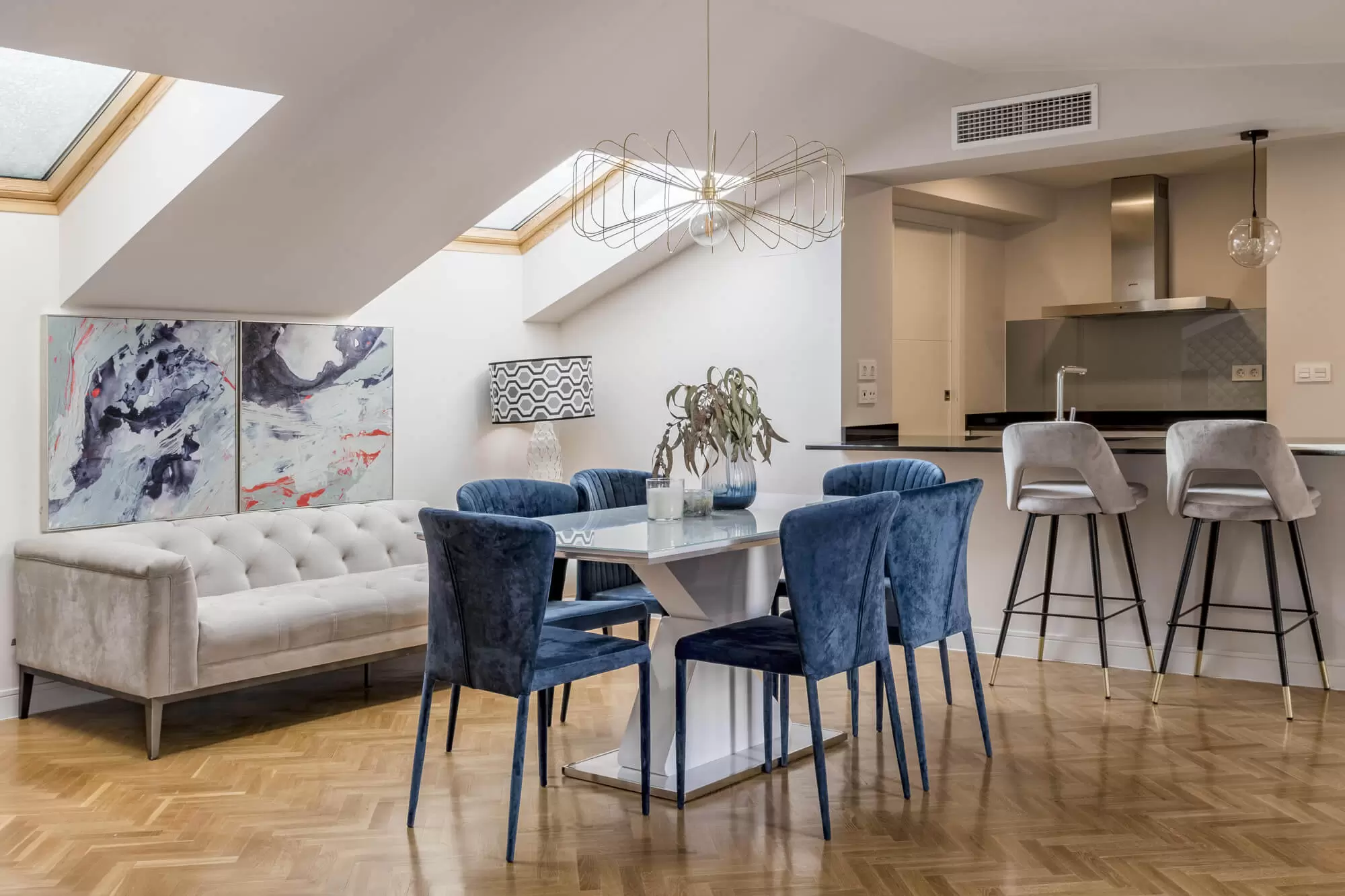 Santa Isabel II is an exceptionally spectacular penthouse apartment in Madrid which is characterized by its luminosity, tasteful style, and spectacular views. The whole flat is integrated and connected with the apartment’s main living space is flooded with natural light which pours in from the orangery.
