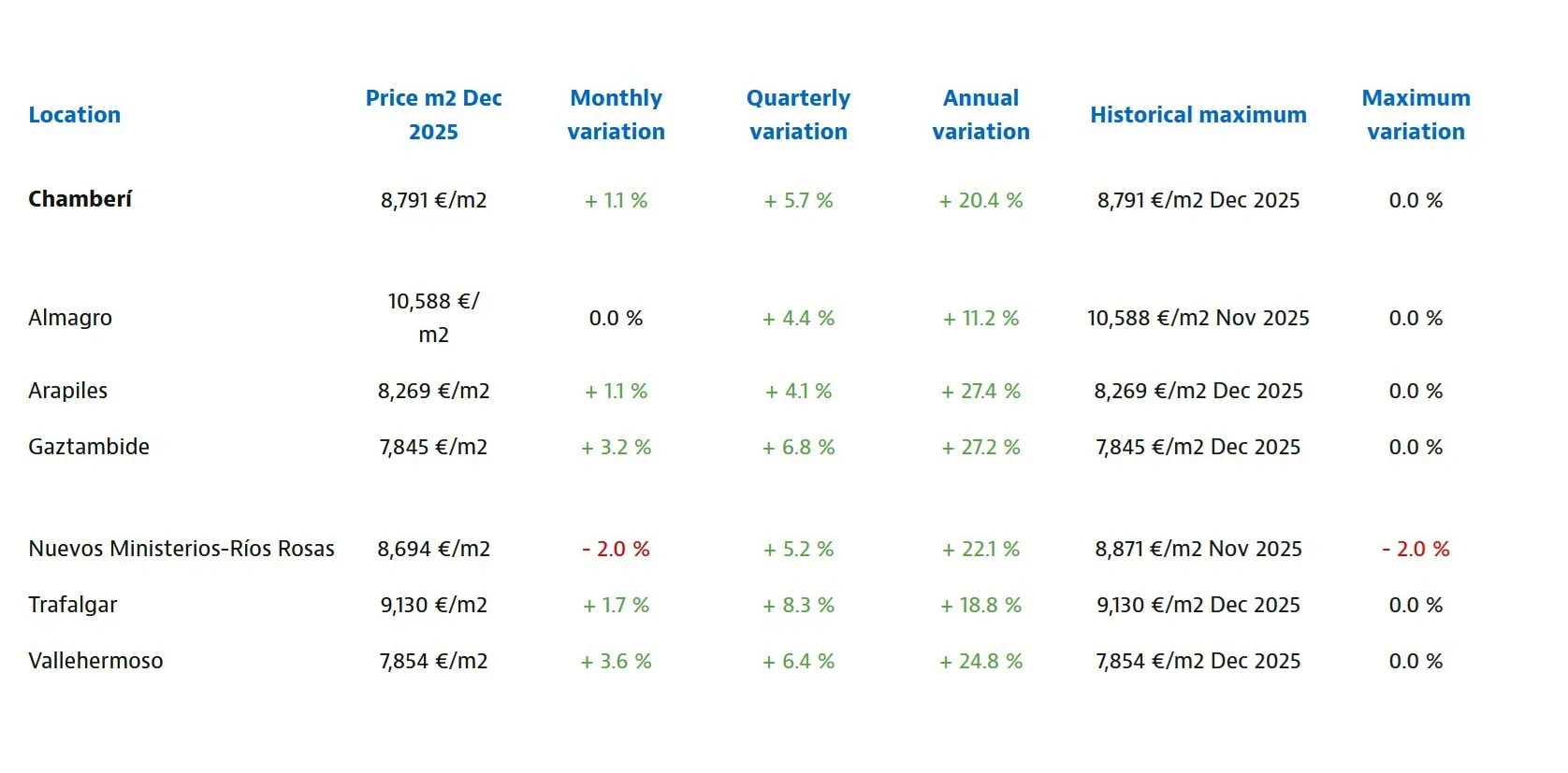 Real estate in the Chamberí neighborhood isn’t cheap: it’s the most expensive real estate in Madrid after Salamanca. Moreover, average prices in the neighborhood increased 20.4% from December 2024 to December 2025. Elegant Almagro is the priciest, where the median price of a home is 10,588€ per square meter. The median price of a home in chic Trafalgar is 9,130€ per square meter; prices in December 2025 were 18.8% more than they were in December 2024. In the old school neighborhood of Arapiles the median price of a home rose to 8,269€ per square meter. The median price of a home in Gaztambide is 6,723€ per square meter. This somewhat staid neighborhood, along with neighboring Arapiles, was one of the main drivers in Chamberí’s stunning price appreciation. Prices in Gaztambide increased 27.2% from December 2024 to December 2025 as buyers fanned out from Trafalgar and Almagro, looking for cheaper property in Chamberí. Even prices in conservative, old money Vallehermoso saw big price increases in 2025; the median home price here was 7,854€ in December 2025; a 24.% increase over prices in 2024.