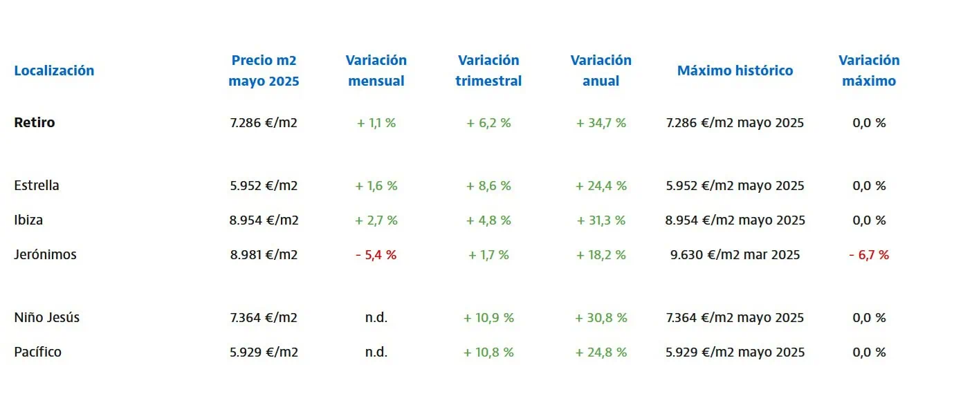 Because it borders the beautiful Retiro Park and is filled with historic monuments, pricing in Jerónimos is the most expensive in Retiro, with a median price of 8,981€ per square meter. Although the prices in Jerónimos are still very expensive, the increased by the smallest amount from May 2024 to May 2025 as people starting looking for houses in neighborhoods that were cheaper. In the very desirable neighborhood of Ibiza, which borders The Retiro park, the median price of a home is 8,954€ per square meter; this is 31.3% up from May 2024 pricing.