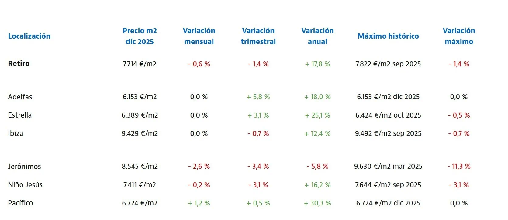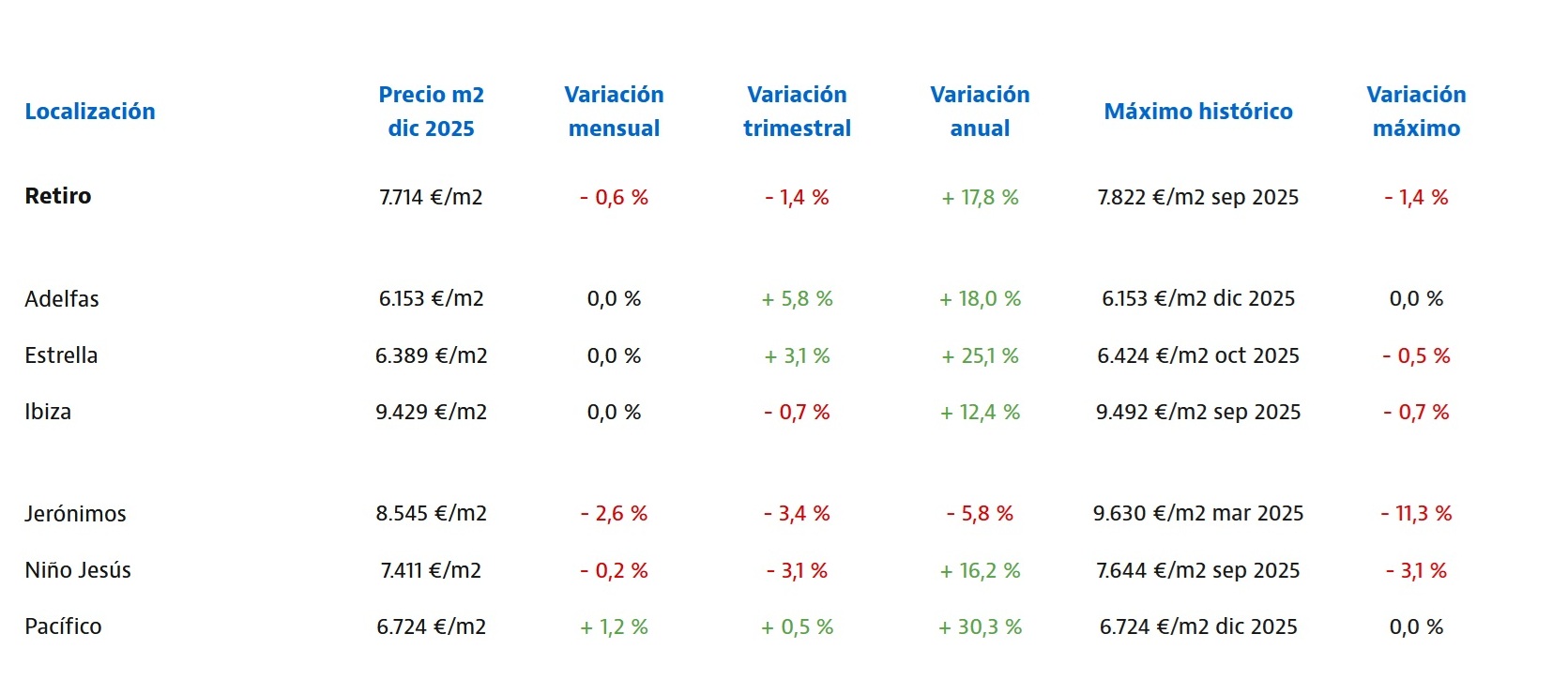 Real estate in the neighborhood of Niño Jésus is much more attainable, with a median price of 7,411€ per square meter. Increasingly popular Pacifico was the breakout in 2025; residential real estate prices increased 30.3% from December 2024 to December 2025. Pacifico real estate averaged 6,724€ per square meter In December 2025. Home prices in Adelfas are the most affordable in Retiro; real estate here is 6,153€ per square meter.
