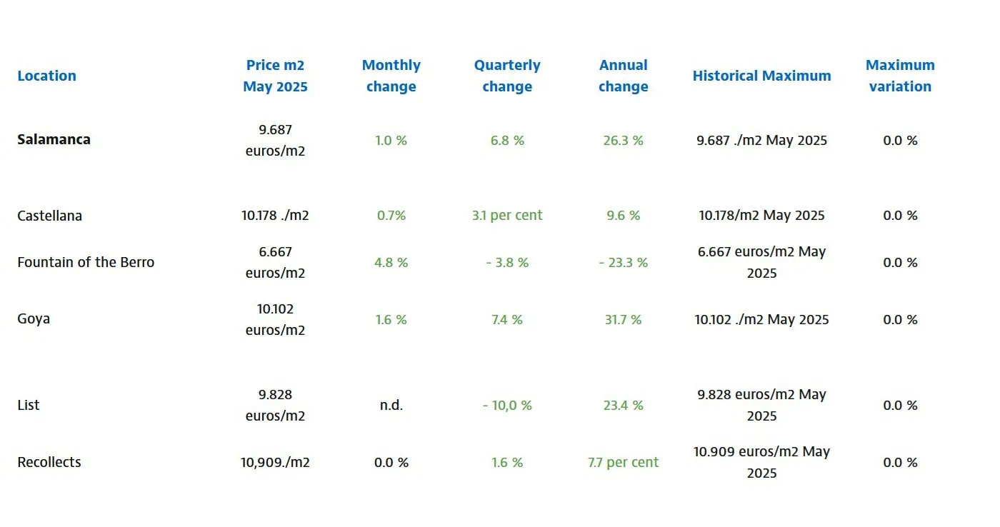 Real estate in the northern part of Salamanca, called Castellana, has a median home price of 10,178€ per square meter. This part of Salamanca has a younger, more dynamic vibe as it is home to IE University, one of Europe’s best business schools. The median price of a home in Lista is 9,828€ per square meter. Fuente de Berro, located in the eastern part of Salamanca, has more attainable prices, with median home prices of 6,667€ per square mete. However, these represent big prices increases over May 2024 prices as buyers looked to the more reasonably priced neighborhoods in Salamanca.