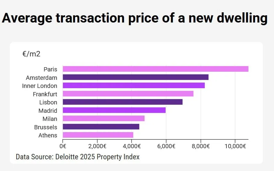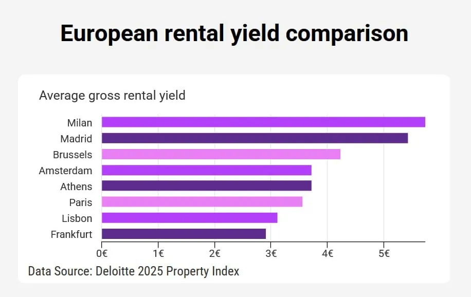 The thing one needs to focus on when purchasing an investment property is not just the price, but how much it can be let for. Madrid’s relatively low prices, combined with its increasingly high rents, translate into very strong rental yields. Using data from Deloitte’s 2025 European Property Index, we calculated gross rental yields across all major European cities. Madrid’s increasingly high real estate prices, and Milan’s increasingly high rents, have allowed Milan to inch out Madrid in rental yields. Madrid still has a very high return compared to other major European cities.